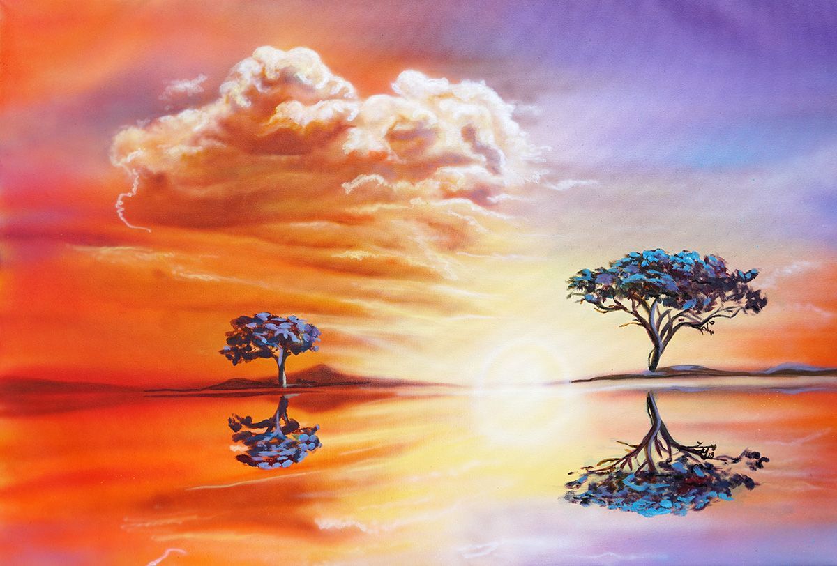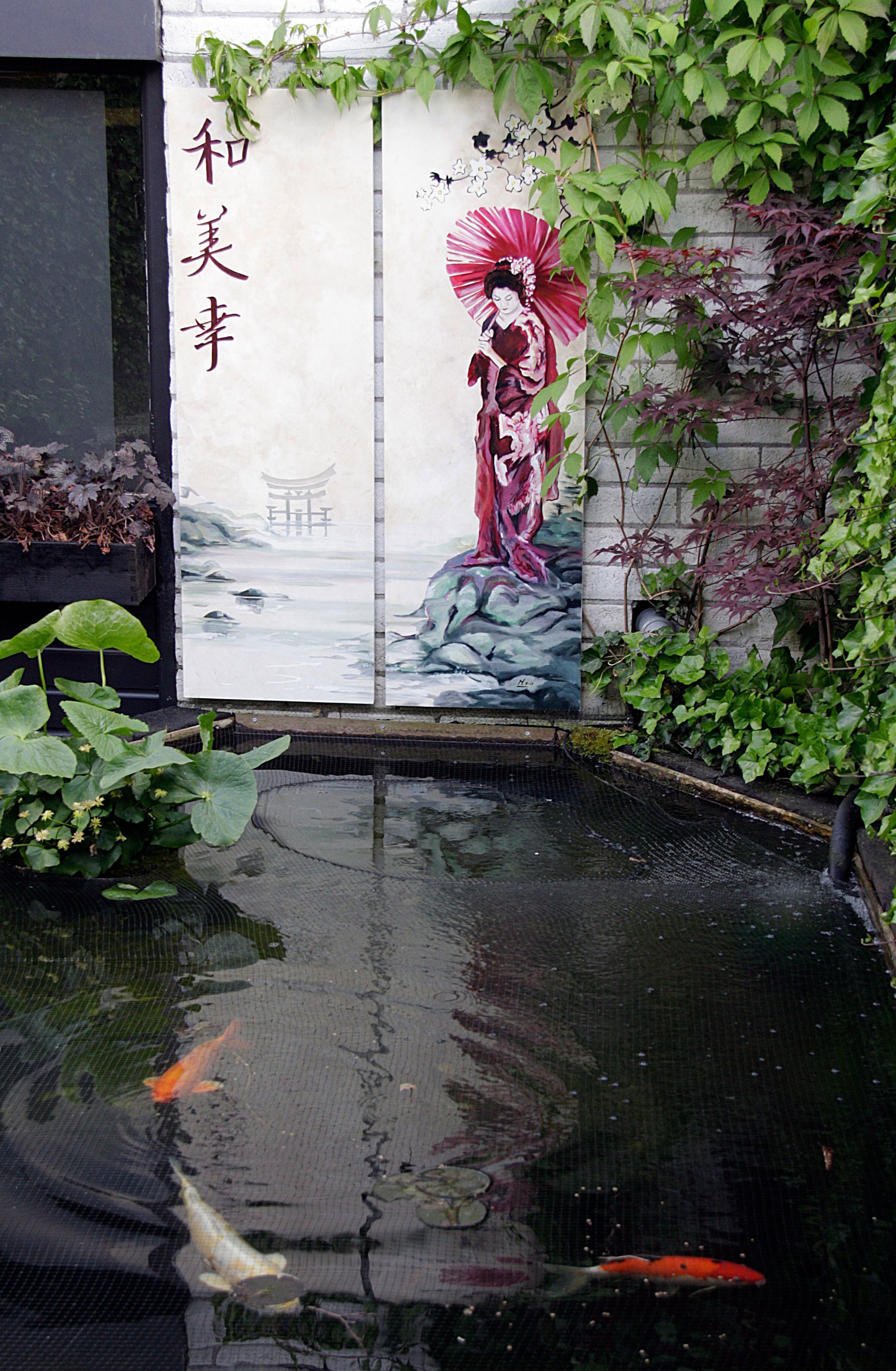 Na vele testen is het gelukt om een schilderij te maken dat echt buiten kan hangen. Door de juiste materialen en afwerkingstechnieken heb ik dit tweeluik kunnen maken voor boven een koivijver. De schilderijen zijn volledig bestand tegen vocht, weer en wind.
